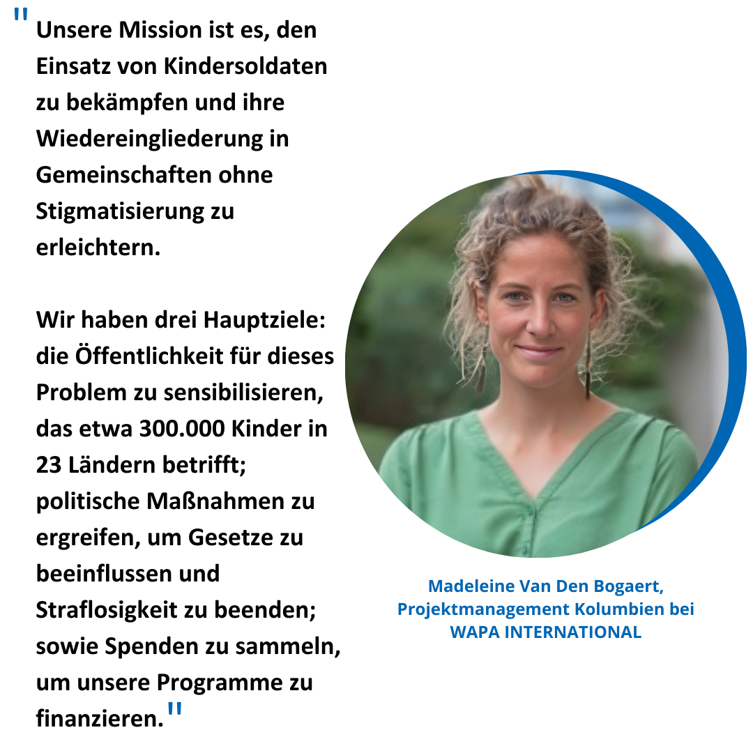 "Unsere Mission ist es, den Einsatz von Kindersoldaten zu bekämpfen und deren Wiedereingliederung in die Gemeinschaften ohne Stigmatisierung zu erleichtern. Wir haben drei Hauptziele: die Öffentlichkeit für dieses Thema zu sensibilisieren, das etwa 300.000 Kinder in 23 Ländern betrifft, politischen Druck auszuüben, um Gesetze zu beeinflussen und der Straflosigkeit ein Ende zu setzen, und Gelder zu sammeln, um unsere Programme zu finanzieren.