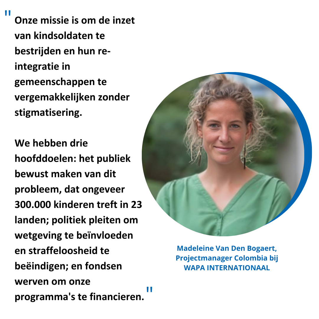 "Onze missie is om het gebruik van kindsoldaten te bestrijden en hun re-integratie in gemeenschappen zonder stigmatisering te vergemakkelijken. We hebben drie hoofddoelen: het publiek bewust maken van deze kwestie, die ongeveer 300.000 kinderen in 23 landen betreft, politieke druk uitoefenen om wetten te beïnvloeden en een einde te maken aan straffeloosheid, en fondsen werven om onze programma's te financieren.